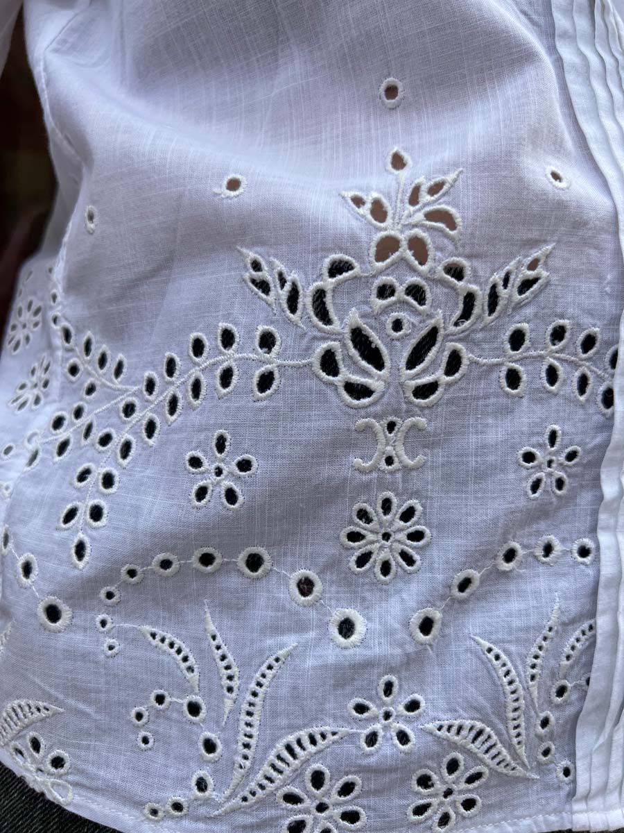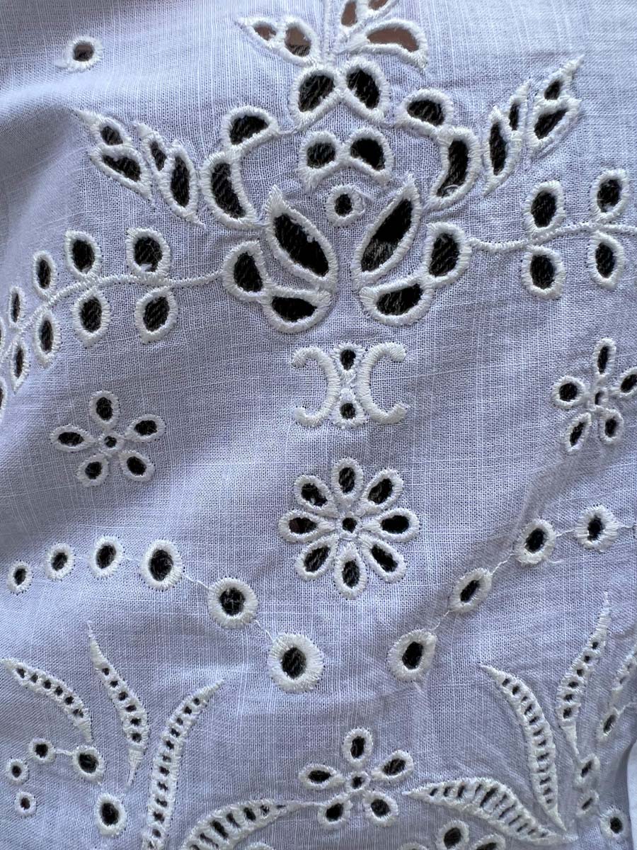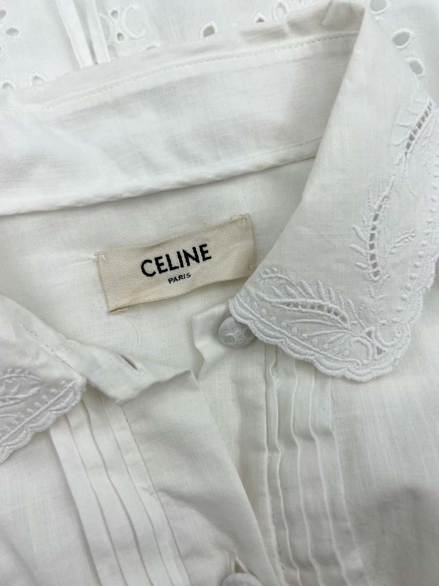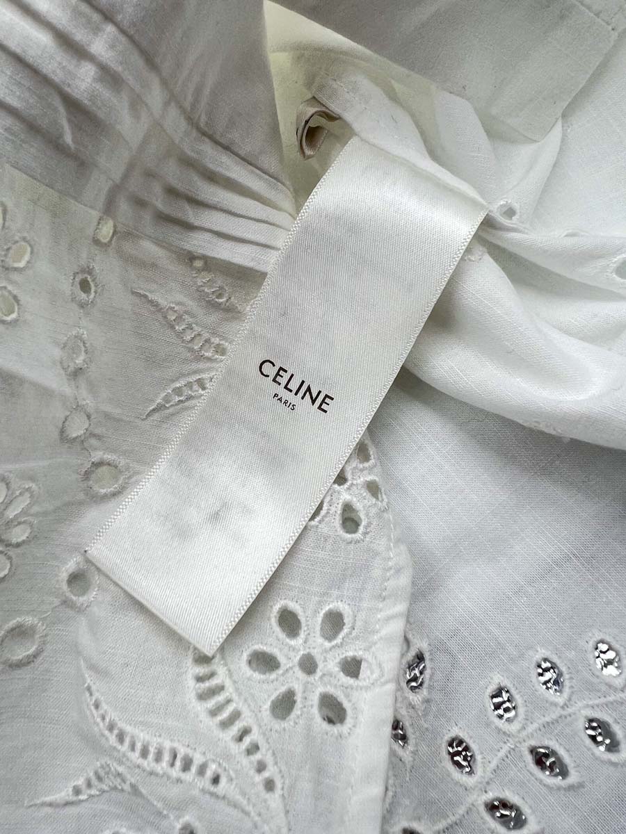 Tout d’abord, la broderie est soigneusement réalisée, avec des motifs présents sur le col et le bas de la chemise. Puis, ces détails brodés ajoutent une touche d’élégance et de subtilité à la chemise, lui conférant une allure unique. De plus, le logo Celine est également brodé, témoignant de l’authenticité de la pièce.